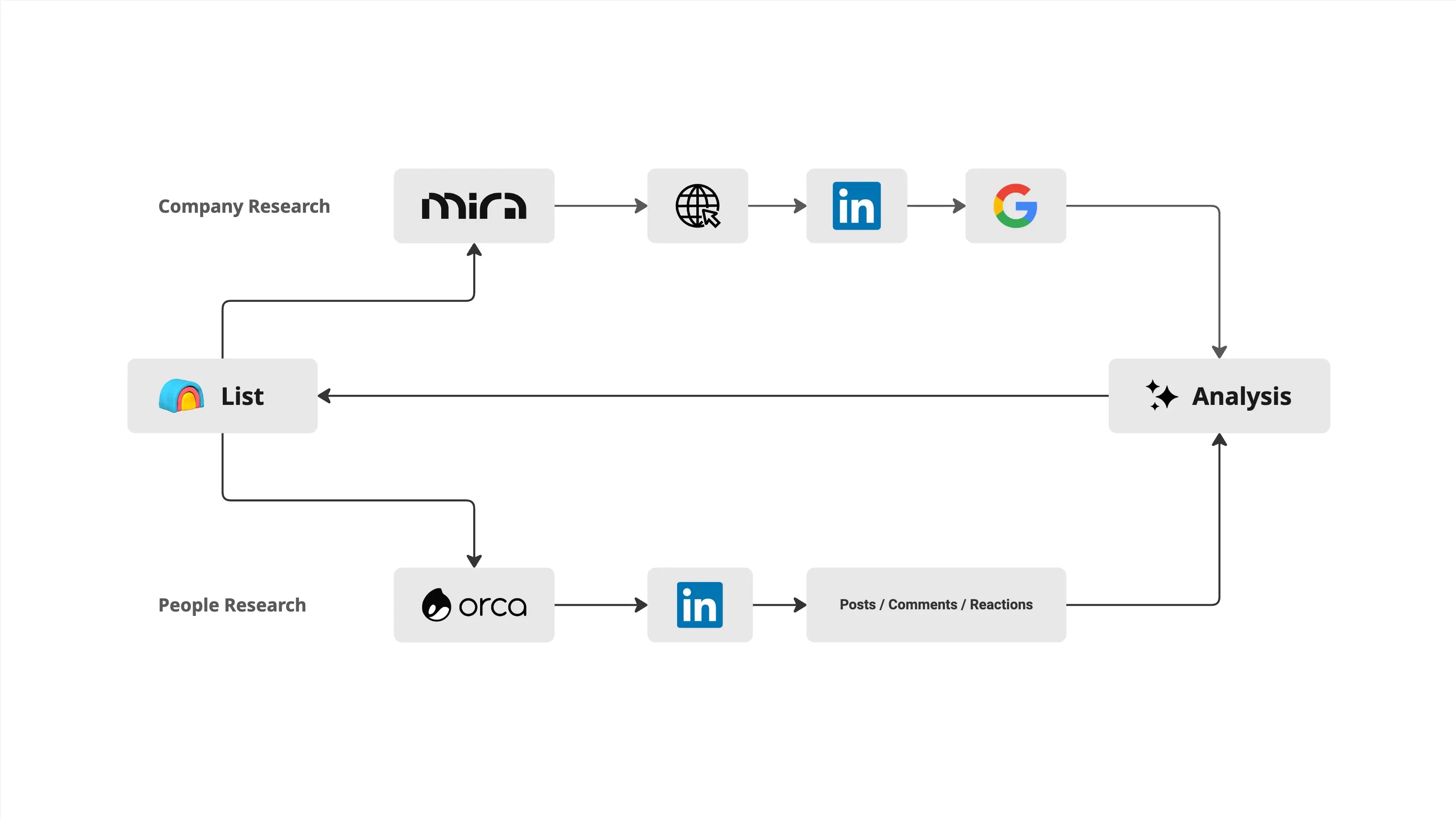 For people research I use Orca, also my open-source project. It's an AI agent for deep LinkedIn profile analysis. You give it a LinkedIn URL and it gathers posts, comments, and reactions, then reasons over all of it to extract insights: what the person is focused on, what challenges they're dealing with, how they communicate, what they care about.